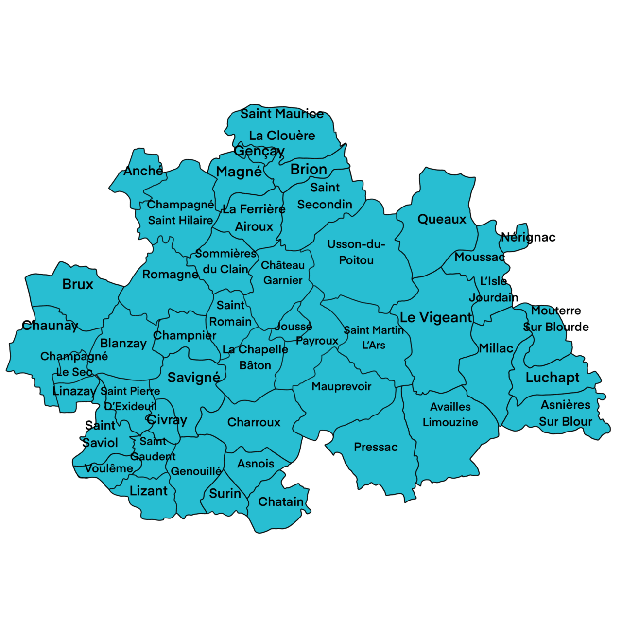 Le territoire couvre 48 communes. Il est à cheval sur la Communauté de Communes du Civraisien en Poitou et la Communauté de Communes de Vienne et Gartempe.